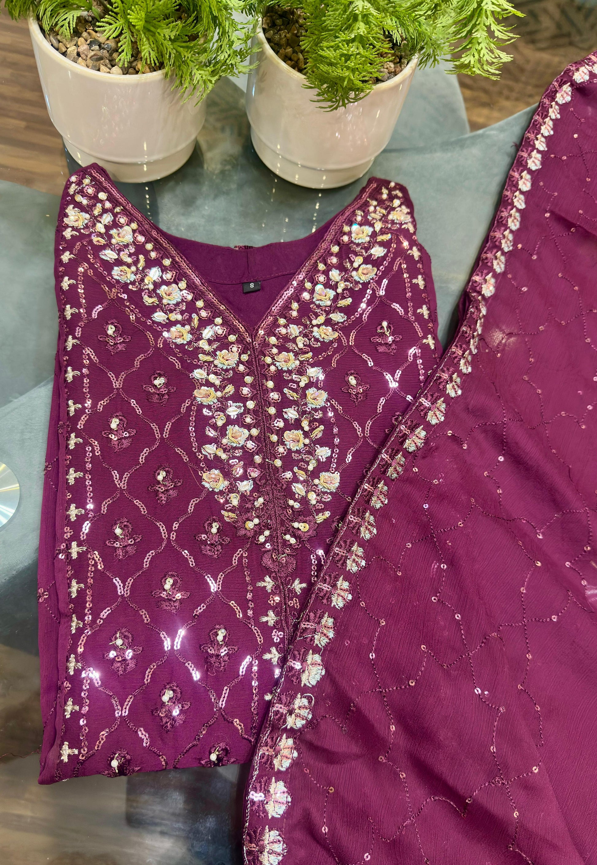 Includes a heavily embroidered shirt, matching trouser, and contrast dupatta.