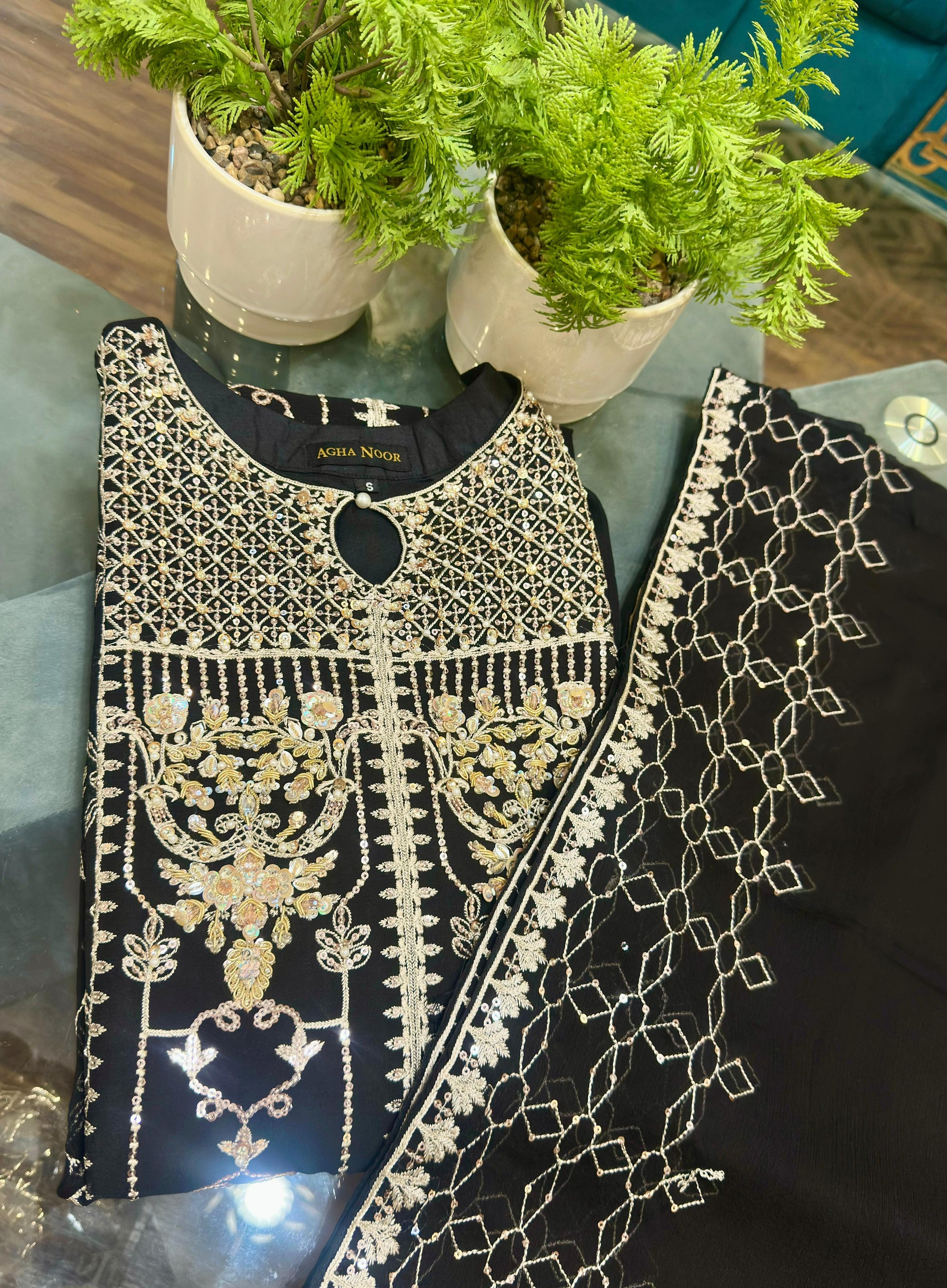Includes an embroidered shirt, finely detailed dupatta, and matching trouser.